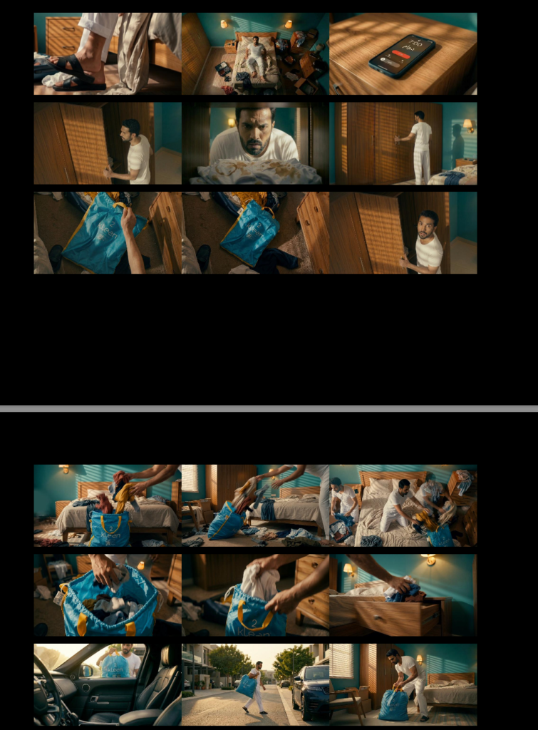 • The “Panic” Hook: Opening with a loud, digital alarm at 7:00 AM immediately triggers a relatable stress response in the viewer. The hero’s wide-eyed realization of an empty wardrobe establishes the “Friction” that the brand is about to solve.